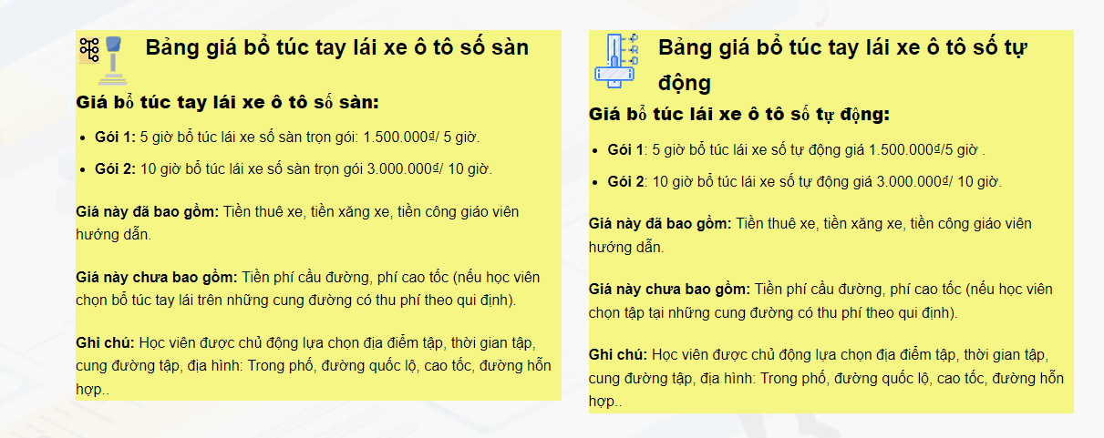 Bảng giá bổ túc tay lái xe ô tô số sàn và xe ô tô số tự động